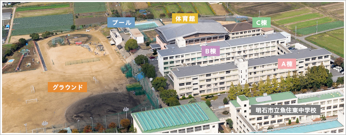 右下のグリーンの屋根の建物(4棟)は、明石市立魚住東中学校の校舎と体育館です。