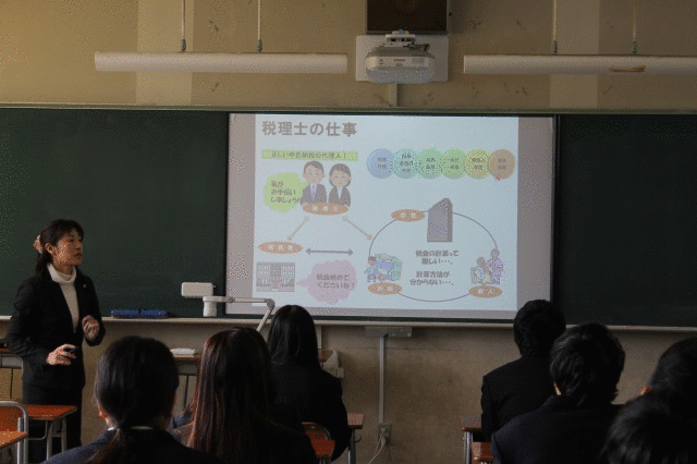 1月15日(月) A棟3階の第2AL室にて3年7組の生徒を対象に、本校羽月先生の現代社会の授業の一環として小山孝治税理士事務所の松岡江利子さんに、税理士による「租税教室」の授業をしていただきました。 自己紹介を兼ねて税理士の仕事内容の説明から始まり、税金の種類と財政に果たす税金の役割、国の歳出入と公債残高の推移を学び、最後に「足りない国の歳入をどうしたらよいか」をディスカッションし、生徒からは「パチンコやタバコにもっと税金をかけては」という意見があったようです。 税金に直接携わっている税理士の方からの授業で貴重なお話を聞けて、より税金への理解ができたと思います。多額の税金を納める社会人になってもらいたいものです。