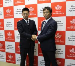 10月30日、プロ野球「東北楽天ゴールデンイーグルス」の後関昌彦スカウト部長や愛敬尚史スカウト、村上修二広報グループマネージャーが、本校硬式野球部水上 桂選手(65回生)の指名挨拶に本校を訪れました。 校長室で楠田俊夫校長、狭間善徳監督、水上選手とご両親に指名の挨拶があり、その後は囲み取材が行われました。写真は、愛敬尚史スカウトと握手する水上選手。 「この場を設けていただき実感が湧き、もっとしっかり練習をしなければならないと思いました。チームを引っ張れるようなキャッチャーになりたいと思います。」と抱負を述べました。 昨年の西武に入団した、松本 航選手(60回生)に続き、2人目のプロ野球選手の誕生です。水上 桂選手、おめでとうございます!!プロの世界で活躍できることを期待しています。