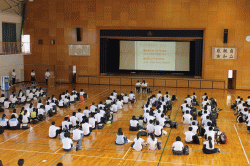 校長先生のあいさつのあと、生徒会役員による学校紹介が行われ、その後、部活動体験会では部活動見学・体験、体験学習会では商業科目の授業体験を行いました。