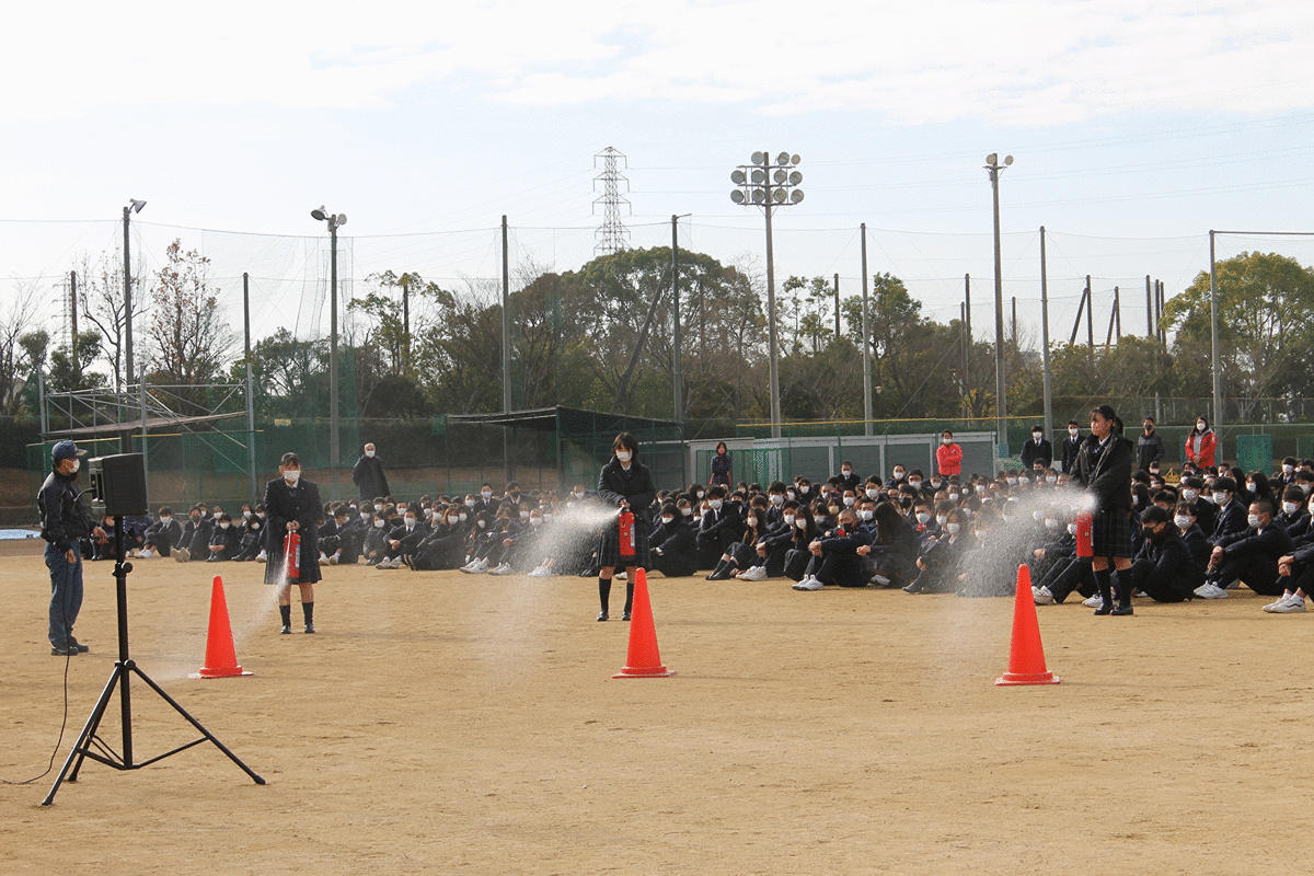 令和3年12月23日(木)、明石消防署魚住分署の署員の方に来ていただき、B棟4階美術室を出火場所に想定した全校生徒・全職員による防災・防火訓練を実施しました。