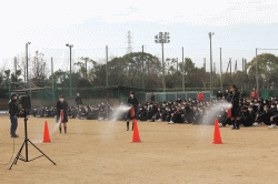 最初に災害クイズの載ったプリントで学習し、地震を想定した机の下に身を隠す訓練を行ったあと,避難を開始しました。避難完了後、グラウンドにて生徒と先生による水の出る消火器を使った初期消火訓練とB棟4階美術室からの放水訓練を行いました。魚住分署の署員の方から避難の心得や消火器の使い方の説明、訓練の講評をいただき、訓練は無事終了しました。