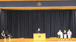 会長候補の大谷 果穂さんと副会長候補の永野 華さん、河村 真帆さんの演説では、生徒会役員としての活動実績を述べ、「皆さんのご期待にそえるように精一杯頑張りたいと思います。信任よろしくお願いします。」と信任を訴えました。