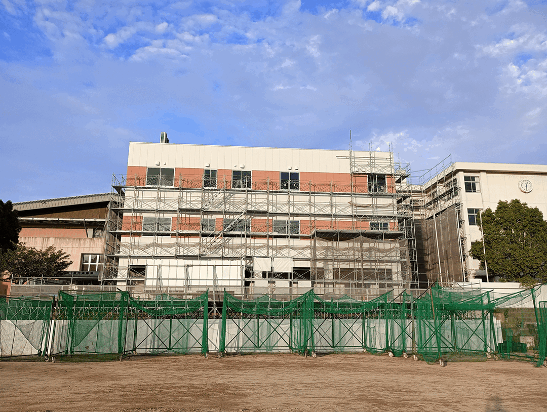 2023年8月18日 足場を外す作業が始まったので、校舎の外観を撮影しました。