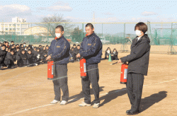 放送のあと、地震を想定した机の下に身を隠す訓練を行い避難を開始しました。避難完了後、グラウンドにて代表の生徒による水の出る消火器を使った初期消火訓練を行いました。魚住分署の署員の方から避難の心得や消火器の使い方の説明、訓練の講評をいただき無事終了しました。