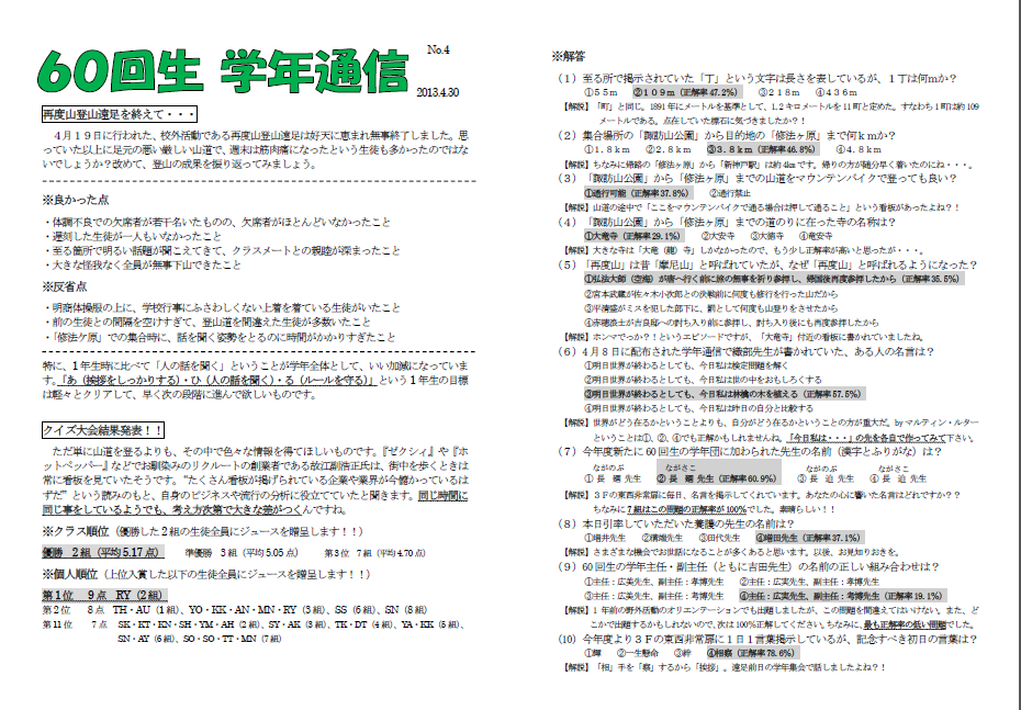 Web版ではイニシャルに置き換えていますが、生徒たちに手渡した印刷した紙の学年通信では本名を載せています。