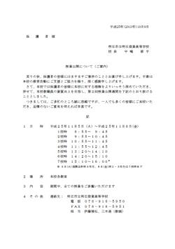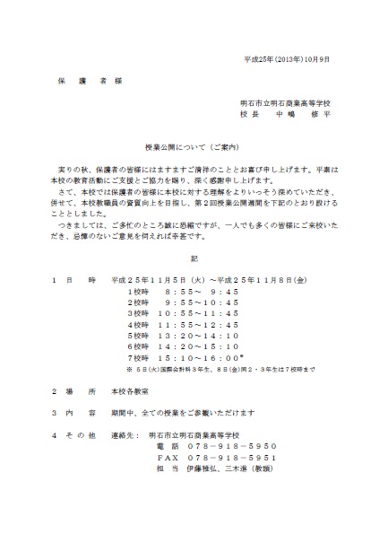 平成25年11月5日(火)から11月8日(金)の期間、本年度第2回目の「授業公開」を実施します。 期間中、全ての授業をご参観いただけます。 どうぞ、お誘い合わせの上お越しくださいますよう、ご案内申し上げます。 魚住駅発のパスの時刻表は次のとおりです。 神姫バス(「明石商業高校前」下車、徒歩2分) http://navi.shinkibus.jp/snk/html/22433_1.html たこバス(「青葉台口」下車、徒歩2分) http://www.city.akashi.lg.jp/doboku/kousei_ka/machizukuri/kotsu/kokyo/taco-bus/rosenzu/documents/10aobadai_001pdf_2.pdf ※ 案内文書は次のリンクからダウンロードできます。