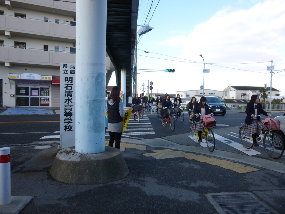 11月11日(月)~13日(水)の3日間、市内7高校のPTAと学校が協同して、市内各地域で通学時の生徒たちを見守り、自転車通学マナーの向上を目指す「チャリ通向上プロジェクト」を実施しました。 自転車、徒歩にかぎらず、大半の生徒がマナーを守れていましたが、ヒャリ!!とする光景も何度かありました。 ご家庭の会話の中で、自転車のマナーについて話しをされてはいかがでしょうか。(本部)
