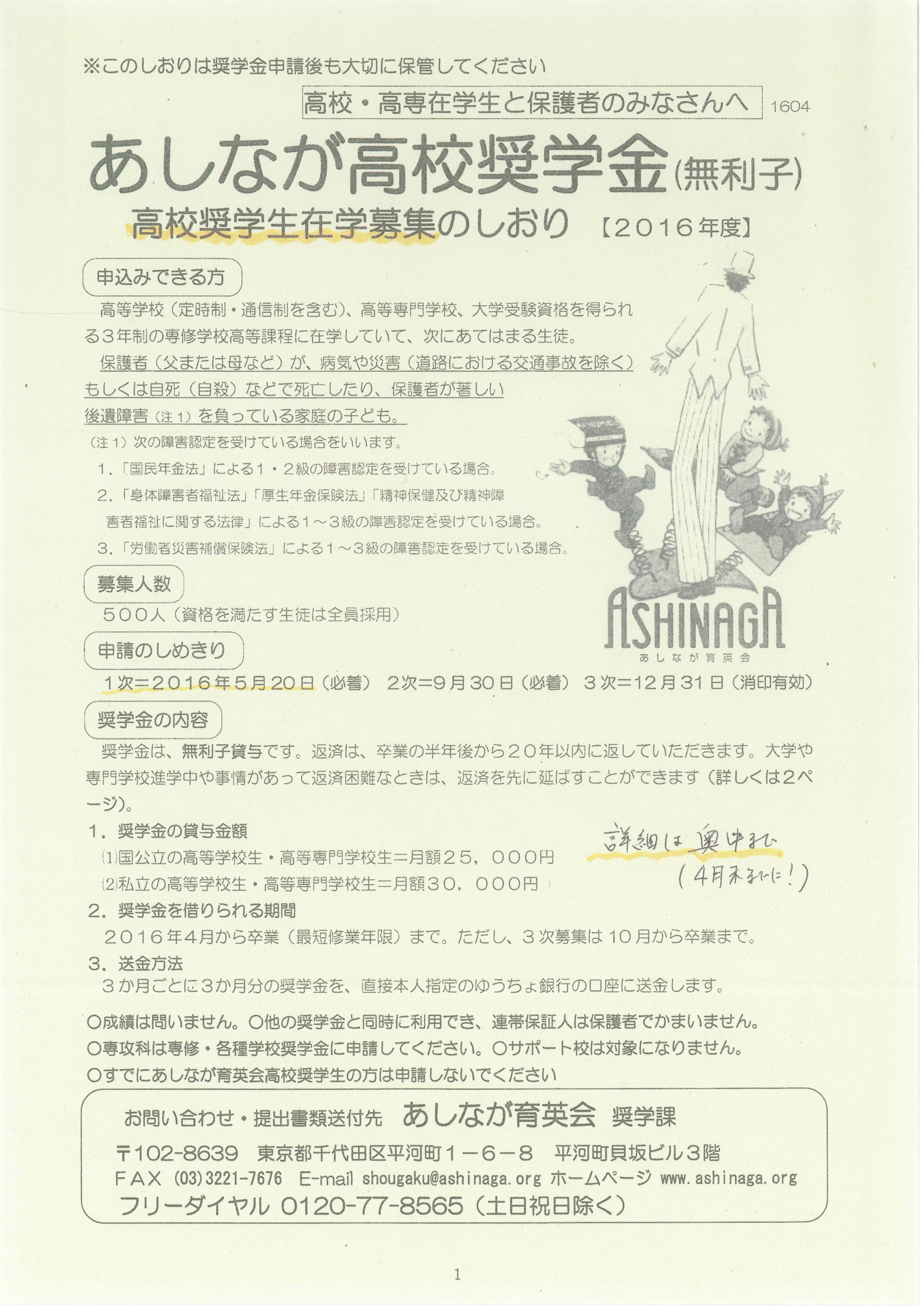 あしなが高校奨学金(無利子)高校奨学生在学募集のしおり(JPEG)【2016年度】