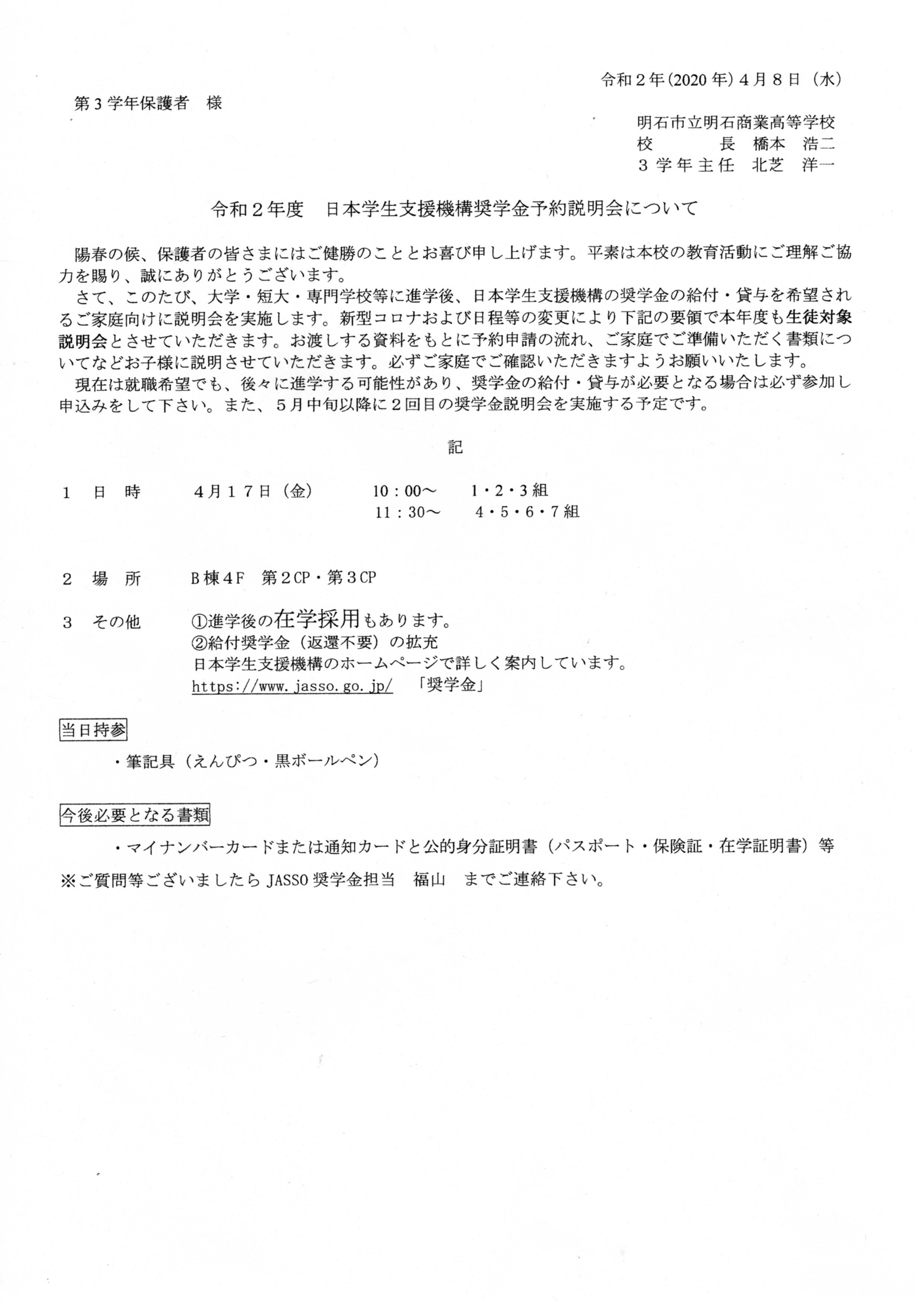 3年生の保護者様 日本学生支援機構奨学金予約説明会のご案内