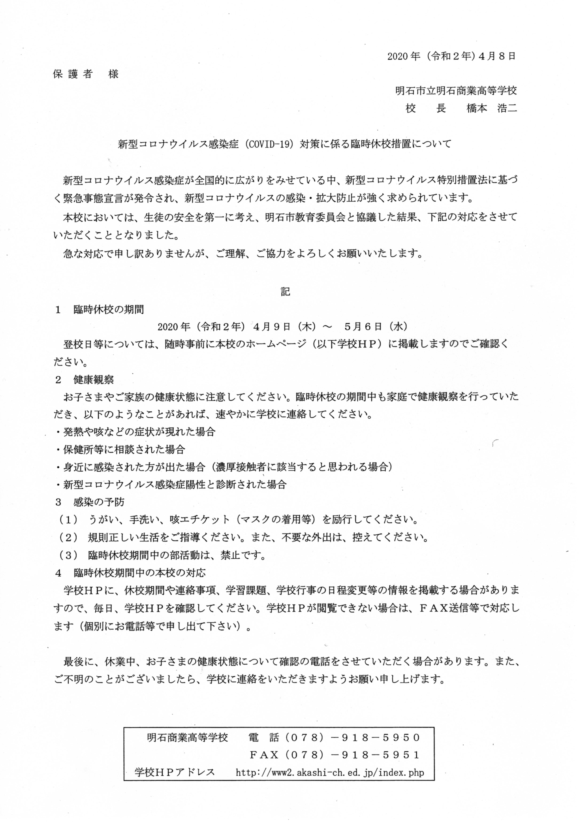 新型コロナウイルス感染症対策に係る臨時休業措置について