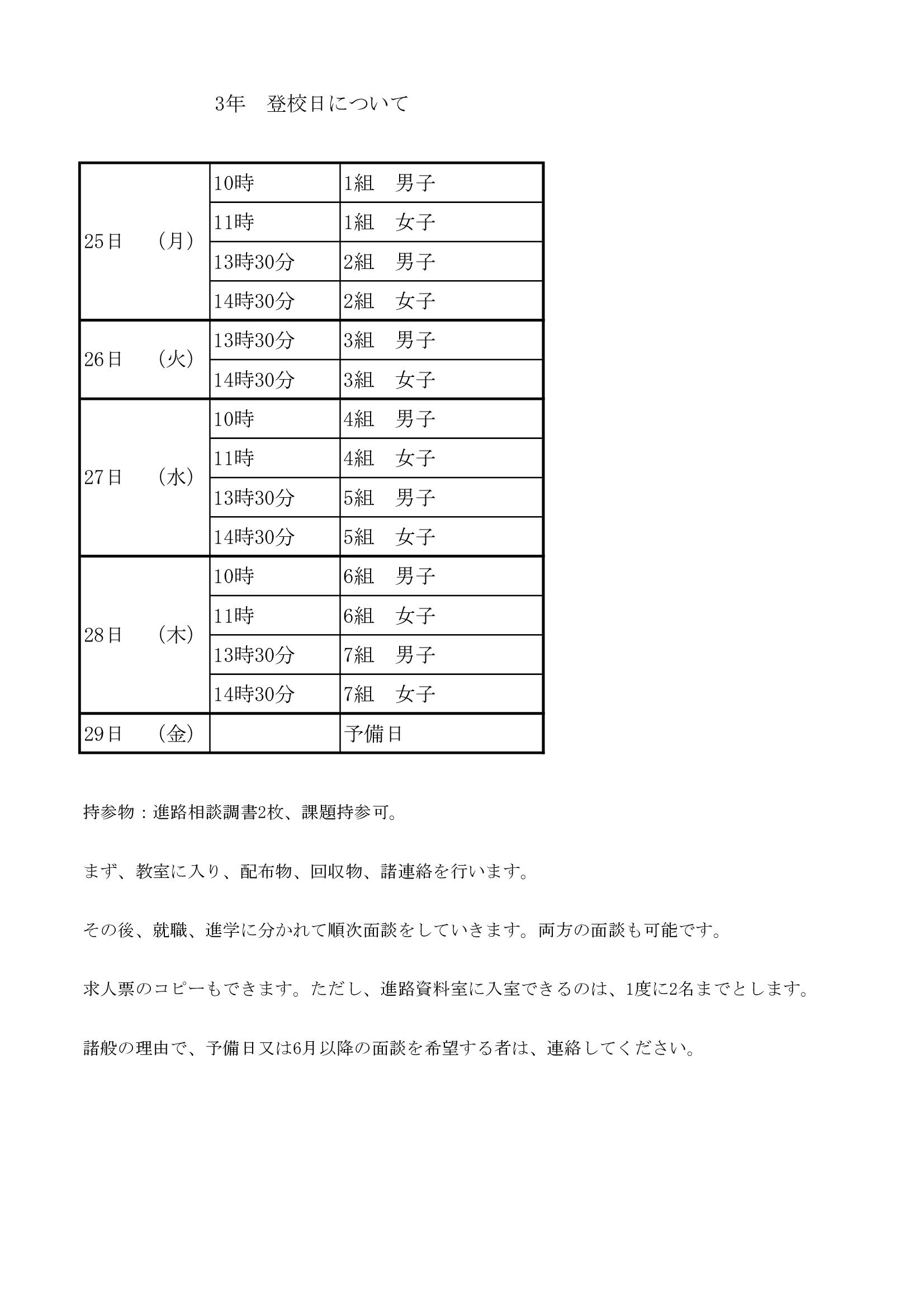 3年 登校日について
