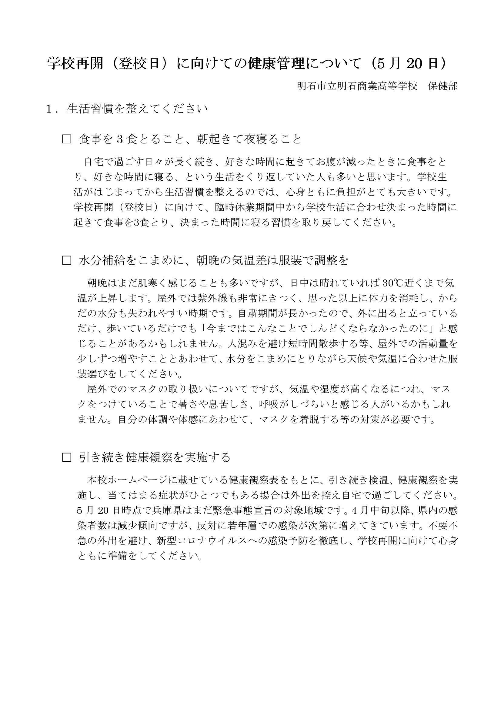 学校再開(登校日)に向けての健康管理について
